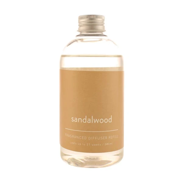 Add a warm and woody scent to your home with our Sandalwood Diffuser Refill. A comforting and warm scent of rich sandalwood blends with soft amber and creamy vanilla to create a smooth woody fragrance within a 240ml bottle. Lasts up to 21 weeks, this diffuser refill is perfect for topping up glass diffuser bottles once finished.