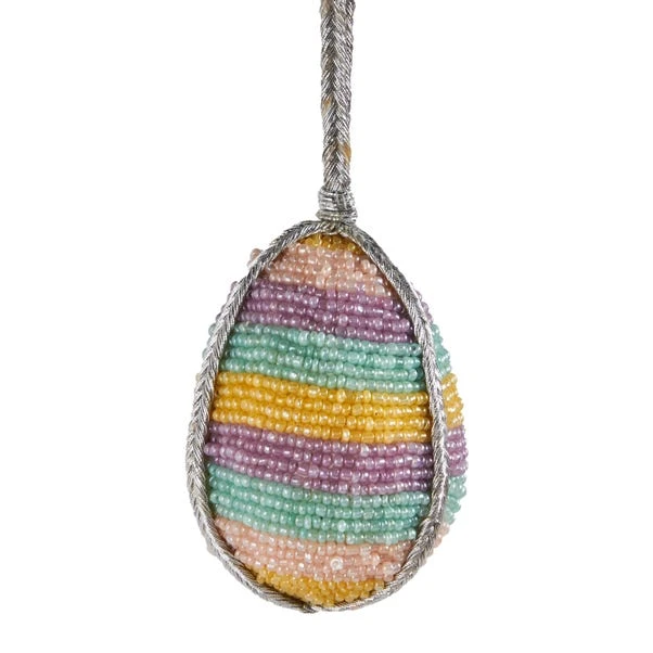 Hand crafted into a beautiful egg shape, our Stripped Rainbow Beaded Hanging Egg is perfect for decorating your home for Easter. The egg has been hand embroidered.