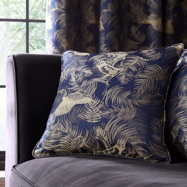 Patterned with a stunning crane design and crafted from a dense woven fabric, this gorgeous cushion is finished in an opulent navy colourway and is ideal for bringing a look of luxury to any room. This cushion features sophisticated piped edging for a glamorous appearance and is fashioned with a stylish sheen finish. Filled with duck feathers for maximum comfort, this cushion is perfect to coordinate with the Crane eyelet curtains and effortlessly coordinates with a variety of decorative styles.