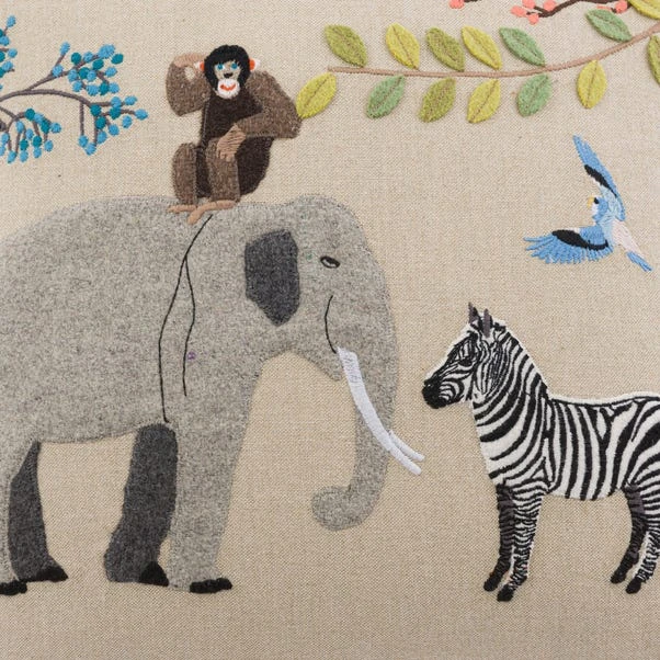 Our Serengeti Animal cushion pictures a variety of wild animals lovingly embroidered and appliqued onto a linen coloured base. The animal shapes made from a wool blend contrast the 100% cotton cushion case beautifully in colour and texture. Update your home with this charming animal scene and complete the look with our co-ordinating boudoir Serengeti Animal cushion. Completed with a plump polyester hollowfibre filling for added comfort.