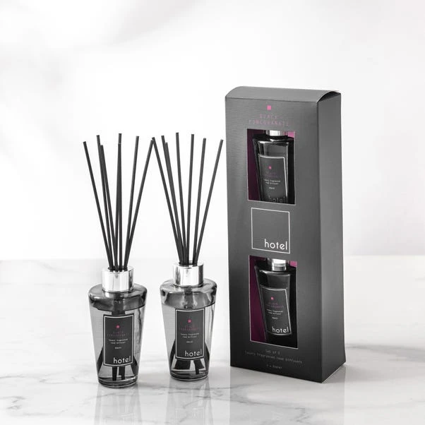 This diffuser set has a dark and opulent pomegranate scent sparkling with juicy red fruit, pink pepper and fig, finished with a rich blend of cedarwood, musk and silky vanilla.. Included in this set are two 80ml diffusers. Each vessel comes in a translucent black vessel with a matte silver effect trim and will last up to 7 weeks each.