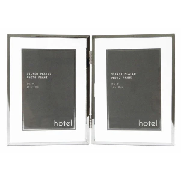 Featuring a foldable outer frame crafted from iron, this elegant Hotel photo frame can hold two 6” x 4” photographs and is designed with a silver electroplate finish.