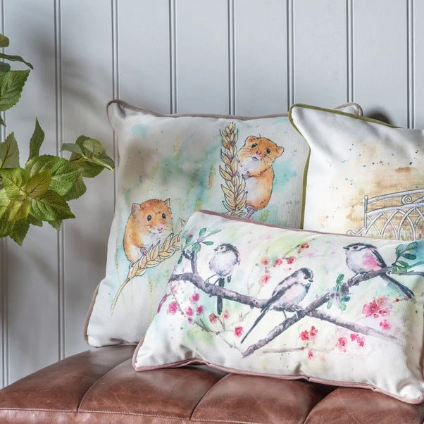Bringing an adorable scene of harvest mice to your living space, this square cushion will add a charming touch of nature to any room. A plain velvet piping and reverse fabric is used in a complementary colour to finish the cushion.