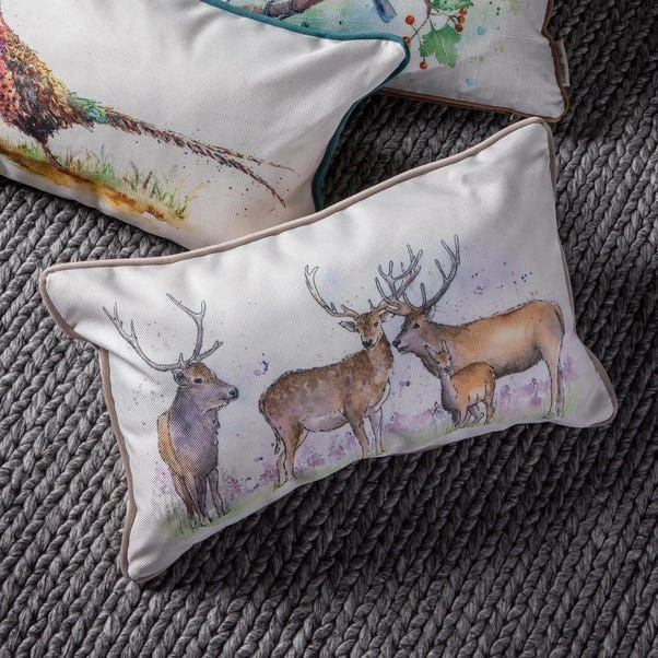 Bringing a delightfully quaint scene to your living space, this rectangular cushion features a group of stags gathered together in their habitat. A plain velvet piping and reverse fabric is used in a complementary colour to finish the cushion.
