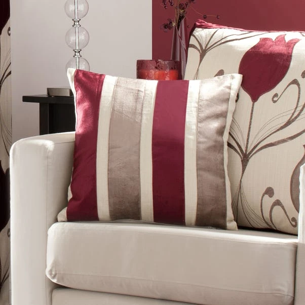 Filled with polyester hollowfibre and featuring a removable cover crafted from a cotton blend, this square cushion is finished with a wine-coloured stripe design on a natural backing.