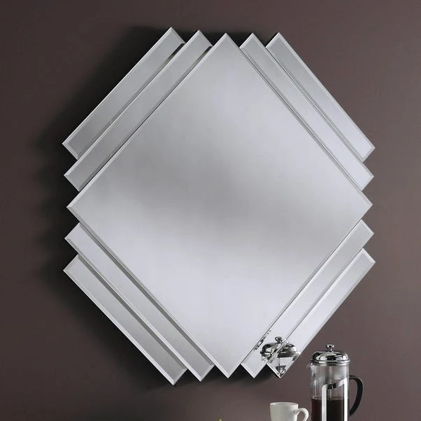This contemporary wall mirror can be hung as a square or diagonally. It features bevelled edges which will instantly give a feeling of space and light in your room. It is also made from engineered wood which is long lasting and moisture resistant.